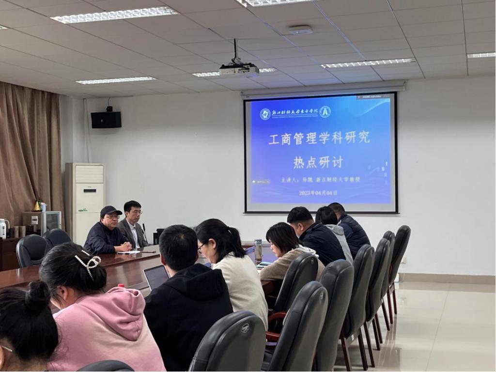 4月4日下午,工商管理学院与科技管理部联合举办的应用型学科建设之学术讲座“工商管理学科研究热点研讨”在3J-518举办。讲座由浙江财经大学工商管理学院学术委员会主任孙凯教授主讲,工商管理学院院长陈晓阳老师主持会议,近20名工商管理学科相关方向的骨干教师和青年教师参加了探讨。