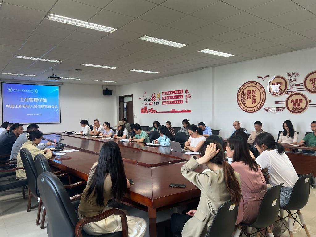 会议首先由王周娈宣读新一届中层正职领导人员的任命文件,选聘陈晓阳为工商管理学院院长、余健为工商管理学院党总支书记。