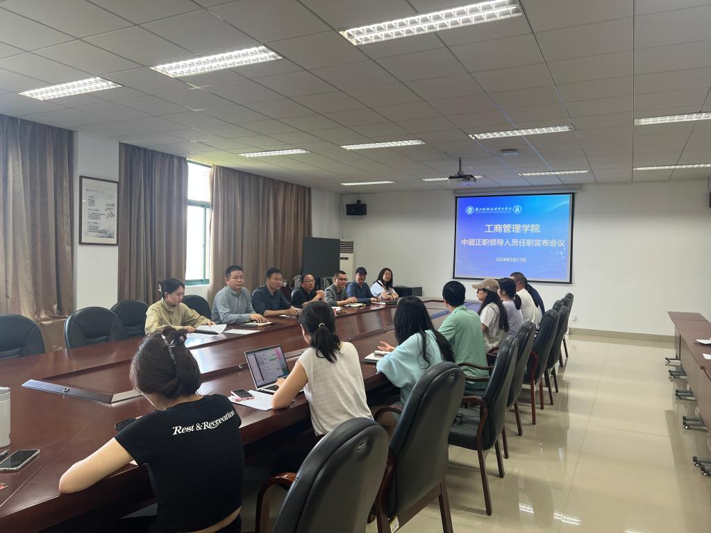 5月17日,工商管理学院在J3-518会议室召开中层正职领导人员任职宣布会。东方学院党委副书记汪风易,党委组织部王周娈,工商管理学院全体教职工参加会议。