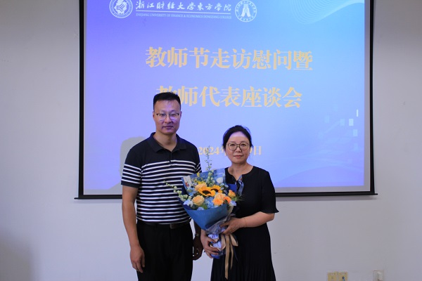 在愉快的氛围中,大家共话教学工作生活时光,回忆起那些难忘的教学瞬间和学生趣事。汪书记为李老师送上鲜花,送上教师节的美好祝福,并借此机会向工商管理学院全体教师致以节日的慰问。