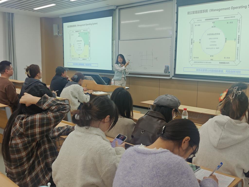 本次讲座以“构建系统化企业管理认知”为核心目标,围绕三大模块展开,各模块层层递进、逻辑紧密搭,建起兼具理论深度与实践价值的知识框架。企业管理模块中,她从公司治理结构底层逻辑切入,结合霍尼韦尔案例拆解财报经营逻辑,还通过解读核心财务数据与原理,从三维度阐释企业盈利模式与经营策略落地方法;企业运作模块中,她剖析了四大业务模式特征及现金流规律,明确两类工厂运营重点,更以六西格玛体系为核心,呈现全流程管理闭环,助力师生理解标准化管理实践;员工绩效与晋升模块中,她结合人才梯队建设,提出基于正态分布的绩效分层思路,划分四类员工并配套差异化路径,为企业人才发展与员工规划提供参考。整场分享以“理论+案例+方法论”的形式,梳理企业运作逻辑,为理解企业运行机制提供清晰分析框架。