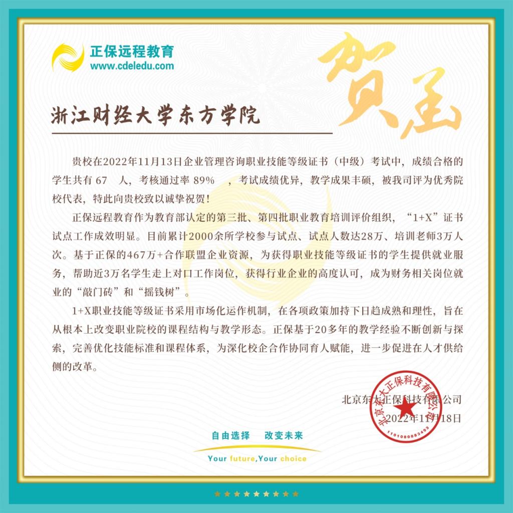 2022年11月13日,“1+X”企业管理咨询职业技能等级(中级)证书考试在S2-205、S2-207机房举行。在学院领导和教务管理部的大力支持下,学院工商管理专业的75名学生顺利参加考试,通过67人,合格率89%,成绩喜人,并获得1+X企业管理咨询职业技能等级证书考试承办方北京东大正保科技有限公司的贺函。