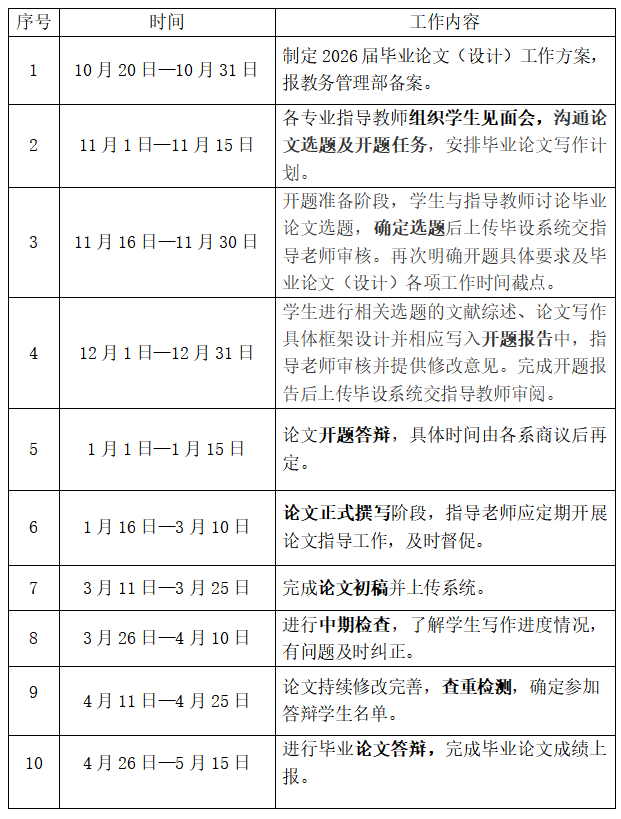 4.学生完成毕业论文工作后,各系应对毕业论文工作认真总结,总结要包括选题分析(性质、难度、分量、综合训练等)、成绩分析等,并于2026年5月20日前将毕业论文最终成绩报送学院教学办公室。