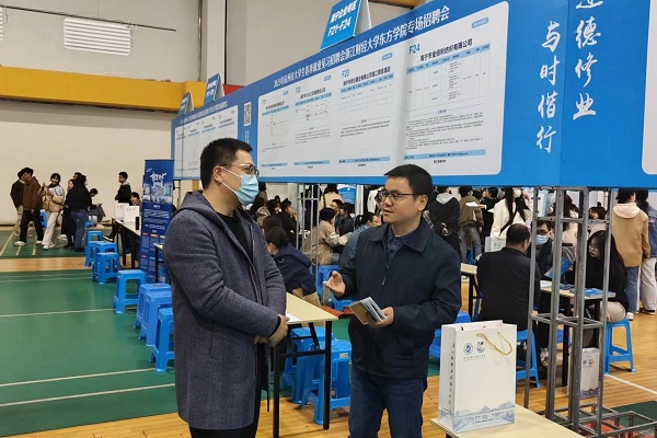 在招聘会现场,宣刚与海宁中国家纺城股份有限公司办公室主任赵威现场交流企业经营、发展对人才的需求情况,探讨应用性、创新型高素质人才的培养路径,商议校企双方如何通过强化校企合作及产教融合项目促进学院培养社会需要的复合型人才。学院产教融合与社会合作中心负责人与海宁中国家纺城就毕业生就业、实习实训、实践教学、秋季博览会、现代产业学院建设等议题与项目进行了商讨,达成多个一致意向。