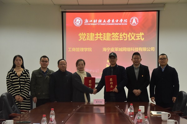 在院长陈晓阳、党总支书记余健、副书记宣刚、副院长周航,以及海宁皮革城网络科技有限公司副总经理陈正玲女士的共同见证下,双方代表签订了党建共建协议与校企合作协议。