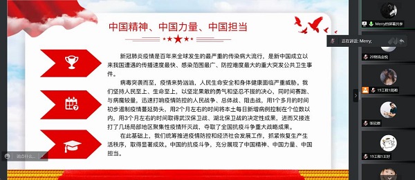 为引导党员同志深刻感悟和弘扬抗疫英雄展现的新时代中国精神,4月22日晚,工商管理学院学生第三党支部组织召开了“抗击疫情我带头,线上学习我努力”线上党日活动。党支部书记马硕晨带领支部全体党员共同学习了习近平总书记在全国抗击新冠肺炎疫情表彰大会上重要讲话,交流学习心得。