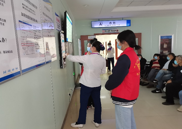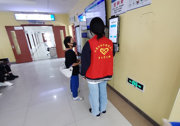 志愿者们帮助不熟悉自助签到机操作的病患操作签到机以保证就诊顺序和资源高效利用。群众们对志愿者态度和服务一致表示好评,给予了暖心的鼓励。作为海宁市中心医院与工商管理学院党建共建的长期合作活动之一,自活动初始至今,我们的志愿者们始终保持着传递温暖的志愿初心,尽善尽美地完成每次志愿服务工作。