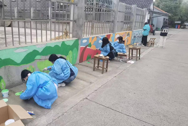 11月12日上午九点整,志愿者们在村委会陆续集合,在队长雷佳怡的带领下,小队与村委会工作人员会合。志愿者们了解了今天的任务——墙绘。随后,工作人员驱车带领我们到了需要绘制壁画的庭院。在这两天里,志愿者们发挥自己的奇思妙想,用巧手在城东村的墙壁上留下了一幅幅精美的画作,那些原本黯淡的墙壁因穿上“花衣”而有了“生命”。志愿者们辛勤绘画的身影在城东村也形成了一道靓丽的风景,路过的行人不约而同地驻足询问。