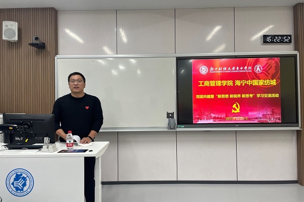 12月5日,工商管理学院与海宁中国家纺城股份有限公司联合举办了一场主题为“新思想、新视界、新思考”的党团共建学习交流活动。此次活动由海宁家纺城党委委员、监事会主席、办公室副主任赵威主持,并邀请工商管理学院党总支副书记宣刚作为党课主讲嘉宾。工商管理学院党总支书记余健、院长助理陈承琦,以及海宁家纺城青年党团骨干和工商管理学院大学生党员共30余人参加党建交流活动。