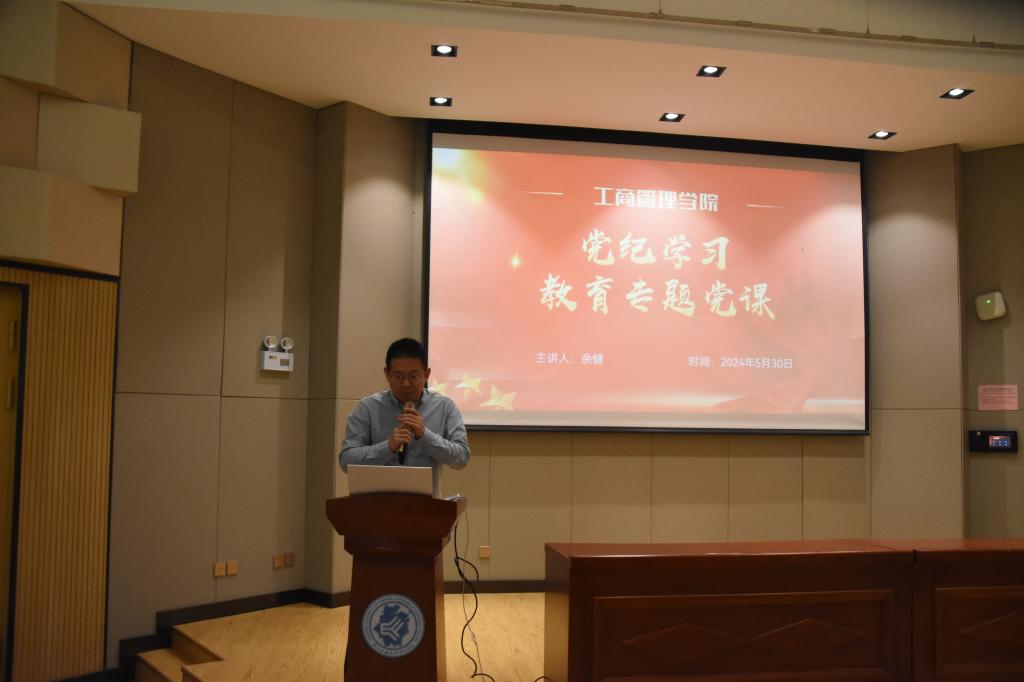 为进一步强化党员的纪律意识,深入学习领会《中国共产党纪律处分条例》(以下简称《条例》),提升党性修养,确保党的纪律和规矩在基层落地生根,工商管理学院党总支于5月30日在3教101开展党纪学习教育专题党课。本次党课由工商管理学院党总支书记余健主讲。
